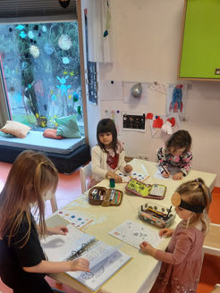 In der grünen Gruppe ist ja im Moment so richtig viel los, es gibt tausend Dinge zu entdecken und zu erforschen, Raumfahrer huschen durch die Garderobe, Raketen starten in der Bauecke, Sachbücher werden wieder und wieder durchgeblättert und Planetennamen erklingen durch die ganze Gruppe beim Farbtürchenspiel.